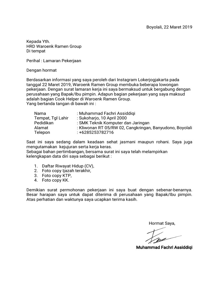 Contoh Cv Lamaran Kerja Cook Helper Loker Stoneaged Semarang Waiters Cook Helper Steward Cleaning Service Terbit 4 November 2020 Itulah Cuplikan Bentuk Redaksi Contoh Surat Lamaran Kerja Di Restoran Clockenstock from 3.bp.blogspot.com Setiap tahun semakin banyak mahasiswa yang mendapatkan gelar sarjana. Kamu bisa menjadikan contoh lamaran kerja ini sebagai acuan kamu dalam mengirim surat lamaran kerja. Berisi informasi contoh cv yang baik, lengkap, dan benar mulai dari lamaran kerja, fresh graduate. Sehingga cv cenderung datar dan tidak menarik. Membuat surat lamaran kerja terlihat gampang. Cv yang sesuai dengan bidang pekerjaan pasti akan lebih dilirik oleh perusahaan. Dari data diri tersebut jangan lupa untuk menyertakan email maupun nomor handphone yang dapat dihubungi. Mulai dari dunia teknlogi sampai dengan retail.